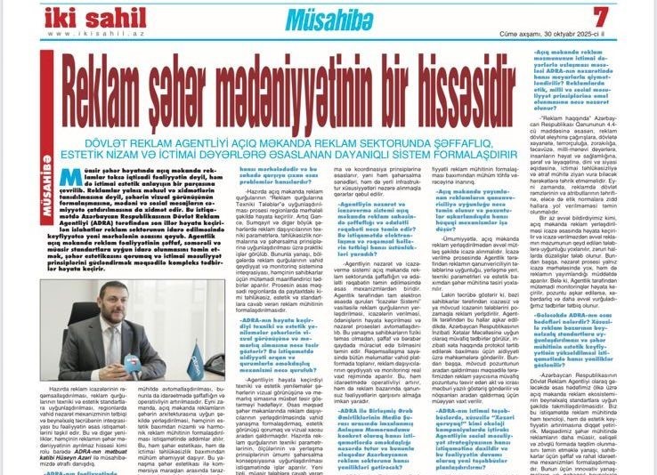 Hazırda reklam icazələrinin rəqəmsallaşdırılması, reklam qurğularının texniki və estetik standartlara uyğunlaşdırılması, regionlarda vahid nəzarət mexanizminin tətbiqi və beynəlxalq təcrübənin inteqrasiyası bu fəaliyyətin əsas istiqamətlərini təşkil edir. Bu və digər yeniliklər, həmçinin reklamın şəhər mədəniyyətinin ayrılmaz hissəsi kimi rolu barədə ADRA-nın mətbuat katibi Hüseyn Azəri ilə müsahibəmizdə ətraflı danışdıq.